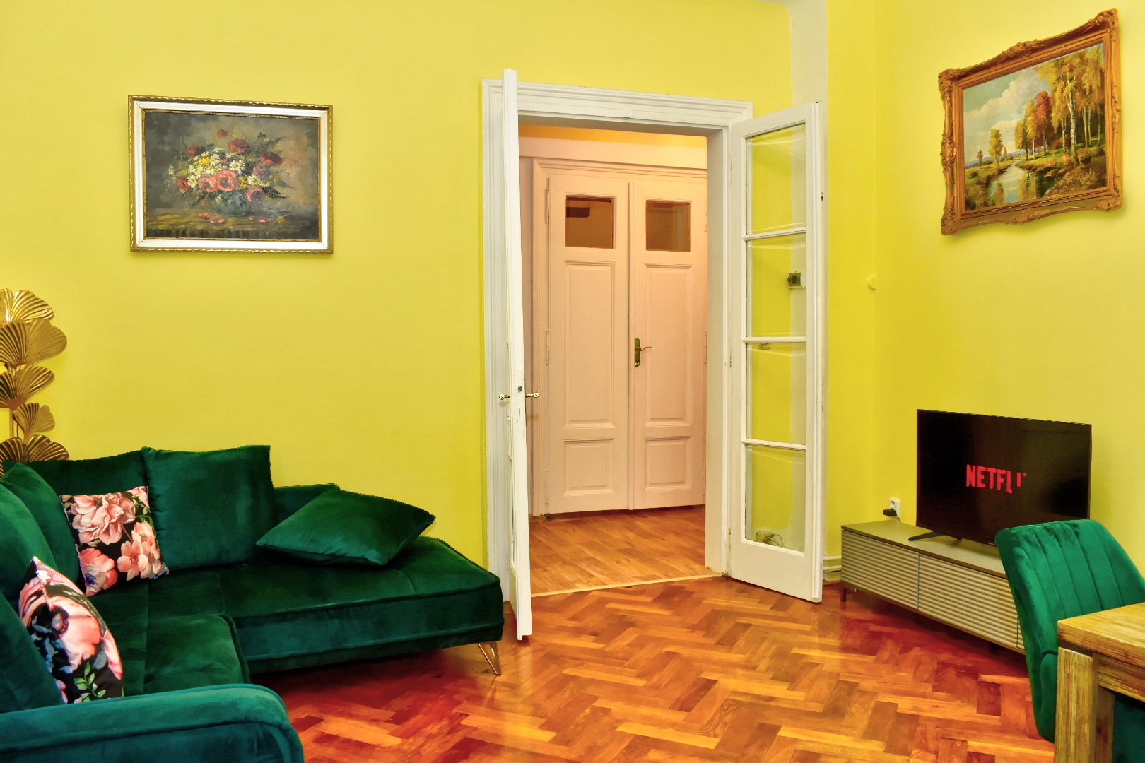 Für Kinder steht ein Etagenbett zur Verfügung. Genießen Sie die Atmosphäre vom Balkon aus mit einem atemberaubenden Blick auf die Promenade. Das Leuchten der Kristallleuchter rundet die Atmosphäre von Eleganz und Komfort ab.